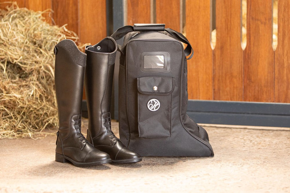 Stiefeltasche speziell für Kinderstiefel mit Reißverschluss vorne. Ausgestattet mit einer kleinen Tasche an der Seite, die mit einem Druckknopf verschlossen werden kann. Die Tasche hat oben zwei Griffe, die mit einem Stück Kunstleder an einem Griff, versehen mit Klettverschluss, miteinander verbunden werden können.