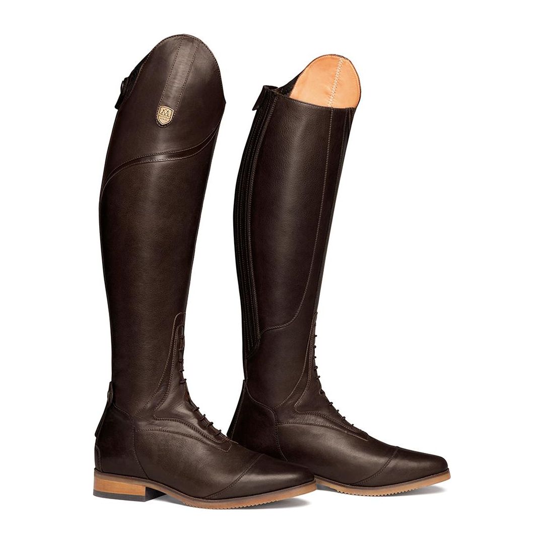 Mountain Horse Springstiefel Sovereign High Rider. Hochwertige Springstiefel mit Elastikeinsatz für eine optimale super enge Passform. Der Mountain Horse Sovereign High Rider Stiefel wird aus feinstem Rindsleder hergestellt und ist damit super haltbar. Der Stiefel besitzt einen modischen Lackstreifen der sich von allen anderen "Standard" Stiefeln abhebt. Die helle Sohle unterstreicht den hochwertigen Look bei der braunen Variante. Die Schaftinnenseite ist aus einem sehr weichen Leder für einen feinen Kontakt zum Pferd hergestellt. Der Elastikeinsatz erlaubt es Ihnen, die Stiefel in dem angegebenen Bereich für die Wade zu bestellen, er ist damit morgens nicht zu weit und abens nicht zu eng. Restbestand, nur noch einzelne Größen lagernd.