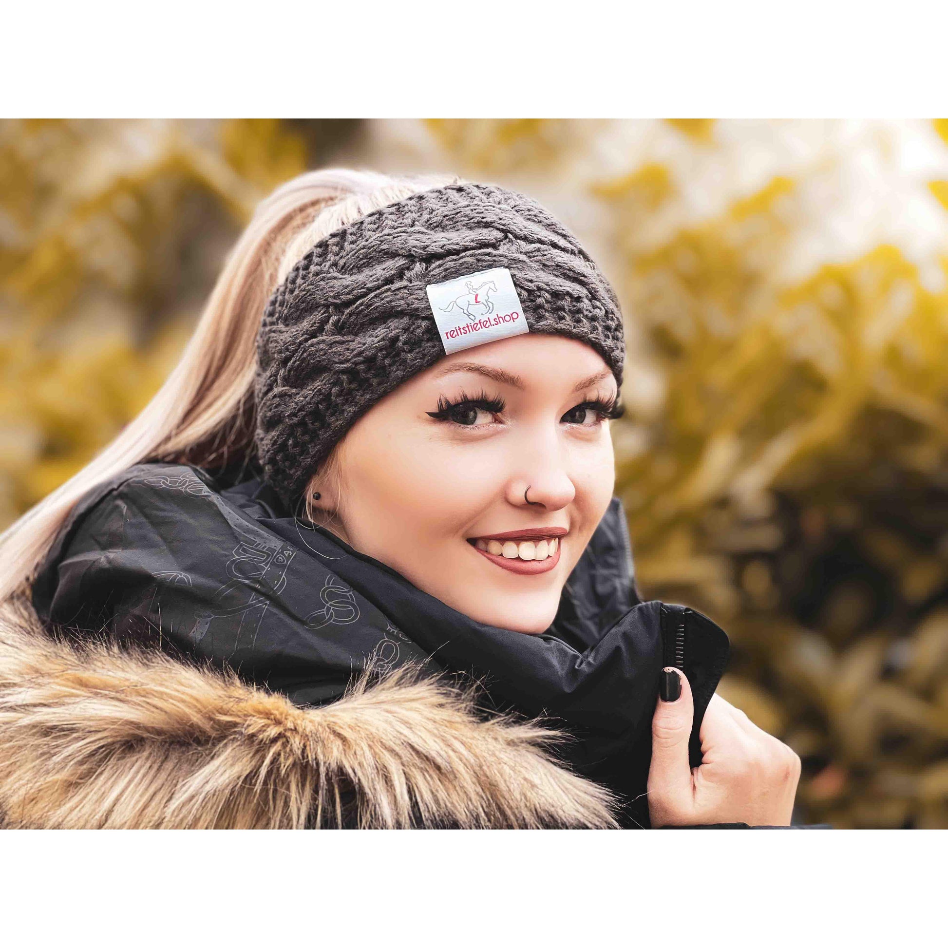 Stirnband in dunkelgrau im Zopfmuster mit weicher Kunstfellfütterung und "Reitstiefel Shop" Logo. 80% Acrylic, 20% Polyester.